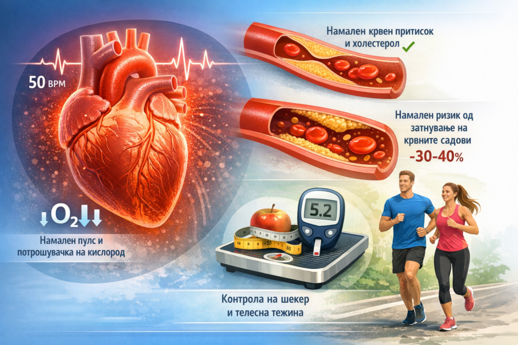 • Намалување на крвниот притисок и холестерол: редовната физичка активност ја подобрува состојбата на ѕидот на крвните садови и метаболизмот на мастите.